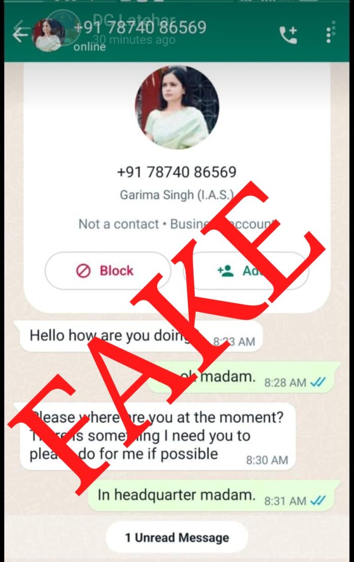 साइबर अपराधियों द्वारा राज्य के आइएएस अधिकारियों के नाम से व्हाट्सएप्प पर FAKE अकाउंट बनाकर लोगों से पैसों की मांग की जा रही है। उपायुक्त, रांची श्री राहुल कुमार सिन्हा के नाम से व्हाट्सएप्प पर FAKE अकाउंट बनाने के बाद साइबर अपराधियों ने उपायुक्त लातेहार श्रीमती गरिमा सिंह के नाम से भी FAKE अकाउंट बनाया है।