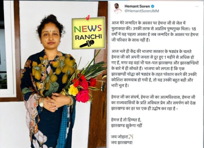 अपने जन्मदिन पर जेल में जाकर हेमंत सोरेन जी से मुलाक़ात की उनकी पत्नी कल्पना सोरेन जी ने ट्विटर पर साझा की अपने मन की बात उन्होंने लिखा की उन्हें पुष्पगुच्छ मिला हेमंत जी से अठारह वर्षों में पहली बार है जो हेमंत जी परिवार के साथ नहीं है आगे उन्होंने लिखा भाजपा को लगता है कि एक झारखण्डी योद्धा को षड्यंत्र के तहत परेशान करने की उनकी कोशिश कामयाब हो गयी है, तो यह उनकी बहुत बड़ी और भारी भूल है