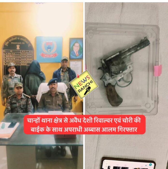 दिनांक-30.12.2024 को समय करीब 16:30 बजे वरीय पुलिस अधीक्षक को गोपनीय सूचना प्राप्त हुई कि चान्हों थाना अन्तर्गत ग्राम झिबरी मोड़ के पास कुछ नवयुवक अवैध हथियार के साथ संदिग्ध अवस्था में घुम रहे हैं। वरीय पुलिस अधीक्षक, रांची एवं पुलिस अधीक्षक ग्रामीण, रॉची से प्राप्त सूचना का सत्यापन करते हुए अविलम्ब छापामारी करने का निर्देश प्राप्त हुआ। उक्त आलोक में पुलिस उपाधीक्षक, खलारी द्वारा थाना प्रभारी, चान्हों के नेतृत्व में एक छापामारी दल का गठन किया गया, जिसमें स०अ०नि० संजय कुमार सिंह एवं थाना सशस्त्र बल के जवानों को शामिल किया गया। छापामारी दल द्वारा ग्राम झिबरी मोड़ पहुंचकर क्षेत्र की घेराबंदी कर छापामारी किया गया। छापामारी के क्रम में एक नवयुवक अब्बास आलम उम्र करीब 30 वर्ष पे० नजमुद्दीन उर्फ वितना पवरिया, सा०-पंडरा, थाना कुड्डु, जिला लोहरदगा को पुलिस बल को देखकर भागने के दौरान गिरफ्तार किया गया तथा उनकी विधिवत तलाशी ली गई, तो उसके कमर में पीछे तरफ छुपाकर खोसकर रखा हुआ एक अवैध छः चक्रिय रिवाल्वर बरामद किया गया। साथ हीं इनके द्वारा प्रयुक्त टी०भी०एस० मोटरसाकिल भी बरामद कर जप्त किया गया। छापामारी के दौरान अंधेरे एवं झाड़ी का लाभ उठाकर एक नवयुवक भागने में सफल रहा, जिसे पहचान कर गिरफ्तारी की कार्रवाई की जा रही है। उपरोक्त अवैध हथियार एवं चोरी के मोटरसाईकिल बरामदगी के आधार पर चान्हो थाना कांड सं0-167/24, दिनांक: 30.12.24, धारा-317 (5) भारतीय न्याय संहिता-2023 एवं 25(1-B)a/26/35 आर्म्स एक्ट दर्ज किया गया है। गिरफ्तार अपराधी अब्बास आलम को न्यायिक हिरासत में भेजा गया।