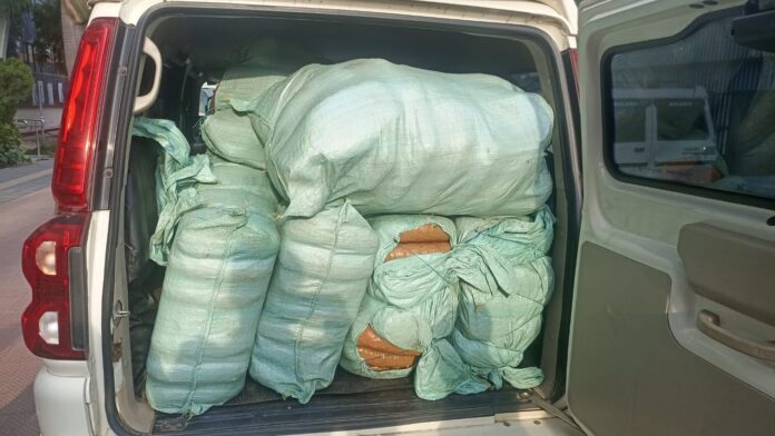 नगड़ी उड़ीसा नंबर स्कॉर्पियो से दो सौ किलो गाँजा बरामद (पूरा पढ़े) नगड़ी पुलिस ने 206 किलोग्राम गांजा के साथ एक तस्कर को गिरफ्तार किया है. लोहरदगा पुलिस से मिली सूचना के आधार पर कार्रवाई कर गांजा बरामद किया गया है. पुलिस को सूचना मिली थी कि गुमला की ओर से एक स्कॉर्पियो में गांजा भरकर रांची लाया जा रहा है. इसके बाद डीएसपी के नेतृत्व में नगड़ी थाना की पुलिस की एक टीम बनाई गई. टीम ने रांची-गुमला सड़क पर टोल प्लाजा के पास वाहन चेकिंग अभियान चलाया. इसी दौरान संदिग्ध स्कॉर्पियो पहुंची, जिसे रुकने का इशारा किया गया, लेकिन चालक वाहन को तेज रफ्तार से चलाकर भागने लगा. पुलिस ने पीछा कर वाहन को पकड़ा. पूछताछ करने पर वाहन चालक ने अपना नाम सज्जाद अंसारी बताया. वह लोहरदगा का रहने वाला है. पुलिस ने गाड़ी की तलाशी के दौरान 206 किलो गांजा बरामद किया. रांची एसएसपी चंदन कुमार सिन्हा ने प्रेस कॉन्फ्रेंस कर यह जानकारी दी.नगड़ी उड़ीसा नंबर स्कॉर्पियो से दो सौ किलो गाँजा बरामद (पूरा पढ़े)