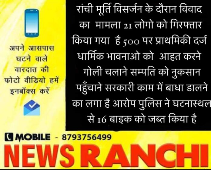 रांची मूर्ति विसर्जन के दौरान विवाद का मामला 21 लोगो को गिरफ्तार किया गया है 500 पर प्राथमिकी दर्ज धार्मिक भावनाओ को आहत करने गोली चलाने सम्पति को नुकसान पहुँचाने सरकारी काम में बाधा डालने का लगा है आरोप पुलिस ने घटनास्थल से 16 बाइक को जब्त किया है