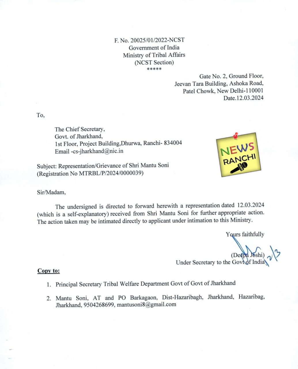 रांची – झारखंड राज्य के हज़ारीबाग़ जिले में केरेडारी प्रखंड अंतर्गत एनटीपीसी की चट्टी बरियातू कोयला खनन परियोजना के एमडीओ (माईन डेवलपर ऑपरेटर) ऋत्विक-एएमआर द्वारा खनन के दुष्प्रभाव के कारण एक दस वर्षीय बिरहोर बच्ची के मौत के मामले में मंटू सोनी की शिकायत पर भारत सरकार के जनजातीय कार्य मंत्रालय ने झारखंड के मुख्य सचिव को पत्र लिखते हुए यह निर्देश दिया है की, कार्रवाई करते हुए शिकायत कर्ता को अवगत कराते हुए मंत्रालय को सूचित किया जाए।