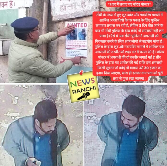 राँची के पंडरा में हुए लूट कांड और फायरिंग मामले में शामिल अपराधियों के घर पकड़ के लिए पुलिस लगातार प्रयास कर रही है, लेकिन 3 दिन बीत जाने के बाद भी राँची पुलिस के हाथ कोई भी अपराधी नहीं लग पाया है।ऐसे में अब राँची पुलिस ने अपराधी को गिरफ्तार करने के लिए आम लोगों से सहयोग मांगा है। पुलिस के द्वारा लूट और फायरिंग मामले में शामिल एक अपराधी की तस्वीर को शहर भर में चस्पा की है। वांटेड पोस्टर में अपराधी की दो तस्वीर लगाई गई है और पुलिस के द्वारा यह अपील की गई है कि इस अपराधी किसी सूचना जो कोई भी बताया उसे 20 हजार का इनाम दिया जाएगा, साथ ही उसका नाम पता को पूरी तरह से गुप्त रखा जाएगा।