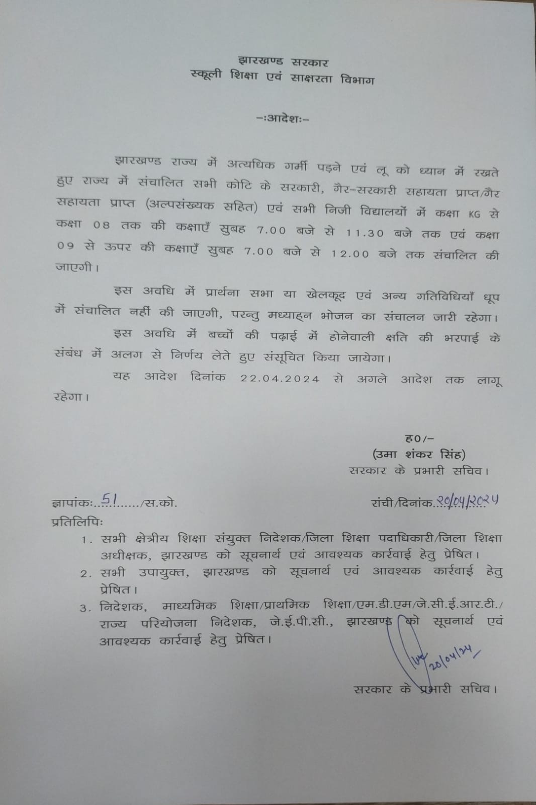 अत्याधिक गर्मी एवं लू को ध्यान में रखते स्कूली शिक्षा एवं साक्षरता विभाग, झारखण्ड सरकार द्वारा स्कूलों के समय सारणी में बदलाव का आदेश दिया गया है। इस आलोक में उपायुक्त, रांची श्री राहुल कुमार सिन्हा द्वारा जिले में संचालित सभी कोटि के सरकारी, गैर-सरकारी सहायता प्राप्त/गैर सहायता प्राप्त (अल्पसंख्यक सहित) एवं निजी विद्यालयों में वर्ग KG से कक्षा आठ की कक्षाएं सुबह 7ः00 बजे से 11ः30 बजे तक एवं वर्ग 09 से उपर की कक्षाएँ सुबह 07ः00 बजे से 12ः00 मध्याह्न तक संचालित करने का निदेश दिया गया है।