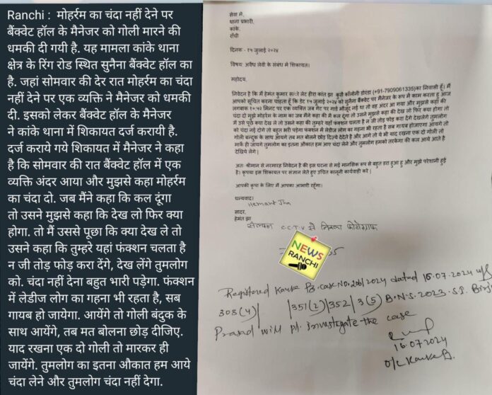 बैंक्वेट हॉल के मैनेजर को गोली मारने की धमकी दी गयी है. यह मामला कांके थाना क्षेत्र के रिंग रोड स्थित सुनैना बैंक्वेट हॉल का 22 है. जहां सोमवार की देर रात मोहर्रम का चंदा नहीं देने पर एक व्यक्ति ने मैनेजर को धमकी दी. इसको लेकर बैंक्वेट हॉल के मैनेजर ने कांके थाना में शिकायत दर्ज करायी है. दर्ज कराये गये शिकायत में मैनेजर ने कहा है कि सोमवार की रात बैंक्वेट हॉल में एक व्यक्ति अंदर आया और मुझसे कहा मोहर्रम का चंदा दो. जब मैंने कहा कि कल दूंगा तो उसने मुझसे कहा कि देख लो फिर क्या होगा. तो मैं उससे पूछा कि क्या देख ले तो उसने कहा कि तुम्हरे यहां फंक्शन चलता है न जी तोड़ फोड़ करा देंगे, देख लेंगे तुमलोग को. चंदा नहीं देना बहुत भारी पड़ेगा. फंक्शन में लेडीज लोग का गहना भी रहता है, सब गायब हो जायेगा. आयेंगे तो गोली बंदुक के साथ आयेंगे, तब मत बोलना छोड़ दीजिए. याद रखना एक दो गोली तो मारकर ही जायेंगे. तुमलोग का इतना औकात हम आये चंदा लेने और तुमलोग चंदा नहीं देगा