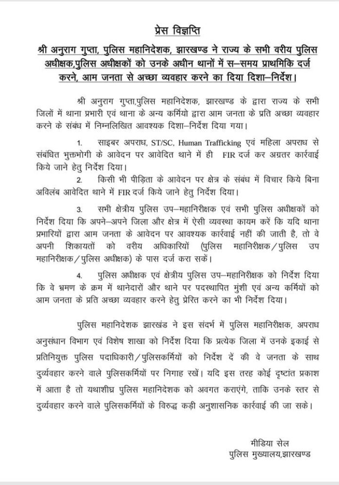 श्री अनुराग गुप्ता, पुलिस महानिदेशक, झारखण्ड के द्वारा राज्य के सभी जिलों में थाना प्रभारी एवं थाना के अन्य कर्मियो द्वारा आम जनता के प्रति अच्छा व्यवहार करने के संबंध में निम्नलिखित आवश्यक दिशा-निर्देश दिया गया।