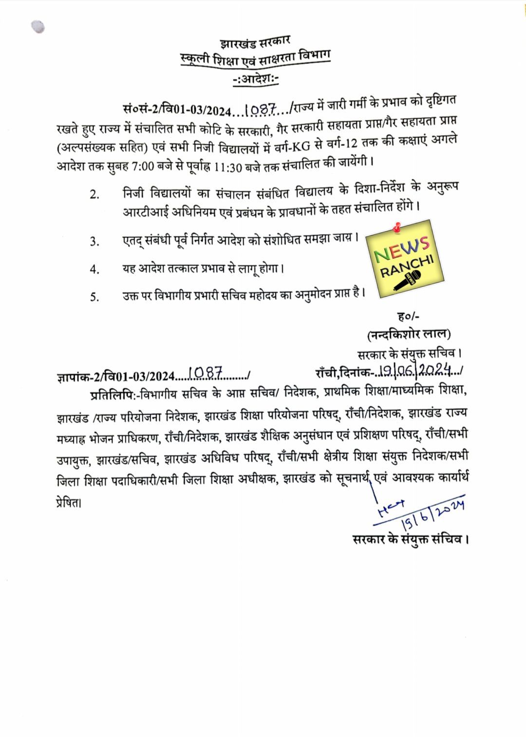 राज्य में जारी गर्मी के प्रभाव को दृष्टिगत रखते हुए राज्य में संचालित सभी कोटि के सरकारी गैर सरकारी सहायता प्राप्त/गैर सहायता प्राप्त (अल्पसंख्यक सहित) एवं सभी निजी विद्यालयों में वर्ग-KG से वर्ग-12 तक की कक्षाएं अगले आदेश तक सुबह 7:00 बजे से पूर्वाह्न 11:30 बजे तक संचालित रहेगी