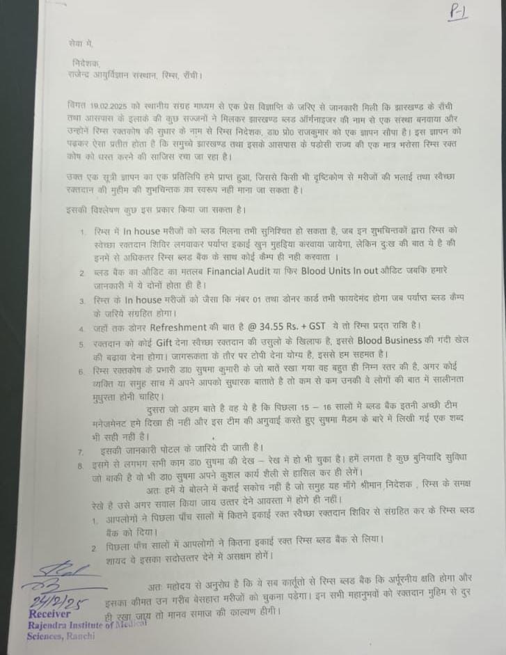 विगत 19.02.2025 को स्थानीय संग्रह माध्यम से एक प्रेस विज्ञाप्ति के जरिए से जानकारी मिली कि झारखण्ड के राँची तथा आसपास के इलाके की कुछ संजजनों ने मिलकर झारखण्ड ब्लड ऑर्गनाइजर की नाम से एक संख्या बनवाया और उन्होंने रिम्स रक्तकोष की सुधार के नाम से रिम्स निदेशक, डा। प्रो० राजकुमार जी को एक ज्ञापन सौपा है। इस ज्ञापन को पढ़कर ऐसा प्रतीत होता है कि समुच्चे झारखण्ड तथा इसके आसपास के पड़ोसी राज्य की एक मात्र भरोसा रिम्स रक्त कोष को धवस्त करने की साजिस रचा जा रहा है।