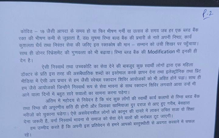 उक्त एक सूत्री ज्ञापन का एक प्रतिलिपि हमें प्राप्त हुआ, जिससे किसी भी दृष्टिकोण से मरीजों की भलाई तथा स्वैच्छा रक्तदान की मुहीम की शुभचिन्तक का स्वरूप नहीं माना जा सकता है।