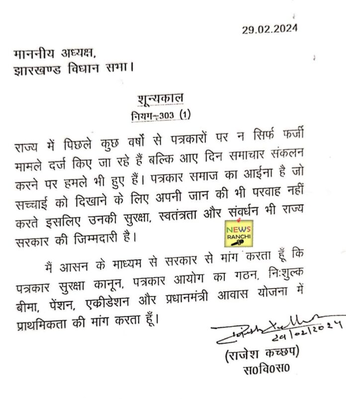 विधायक राजेश कच्छप ने विधानसभा में शून्यकाल के दौरान पत्रकार सुरक्षा कानून बनाने की मांग की। उन्होंने कहा कि पत्रकार समाज का आईना होते हैं, विषम परिस्थितियों में काम करते हैं। उन्हें पत्रकार स्वास्थ्य बीमा, आवास व अन्य सुविधाएँ प्राथमिकता के आधार पर मिलना चाहिए। में पिछले कुछ वर्षों से पत्रकारों पर न सिर्फ फर्जी मामले दर्ज किए जा रहे हैं बल्कि आए दिन समाचार संकलन करने पर हमले भी हुए हैं। पत्रकार समाज का आईना है जो सच्चाई को दिखाने के लिए अपनी जान की भी परवाह नहीं करते इसलिए उनकी सुरक्षा, स्वतंत्रता और संवर्धन भी राज्य सरकार की जिम्मदारी है।