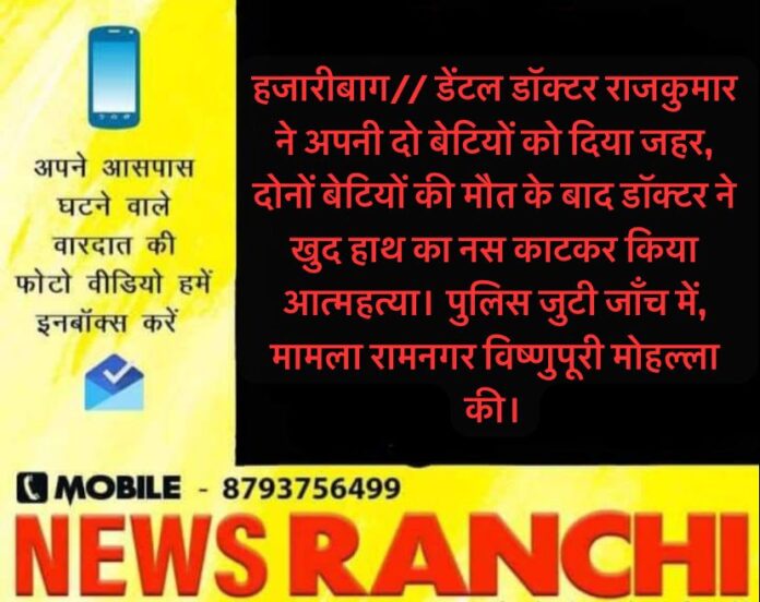 हजारीबाग// डेंटल डॉक्टर राजकुमार ने अपनी दो बेटियों को दिया जहर, दोनों बेटियों की मौत के बाद डॉक्टर ने खुद हाथ का नस काटकर किया आत्महत्या।कटकमदाग पुलिस जुटी जाँच में, मामला रामनगर विष्णुपूरी मोहल्ला की सभी मृतकों की बॉडी पोस्टमार्टम के लिए भेजा गया शेख़ भिखारी हॉस्पिटल