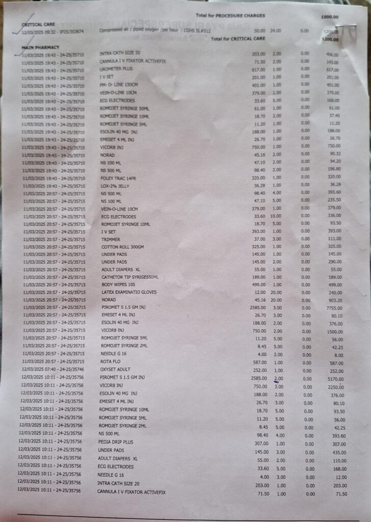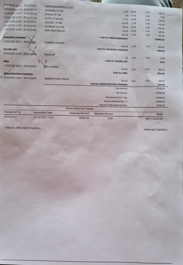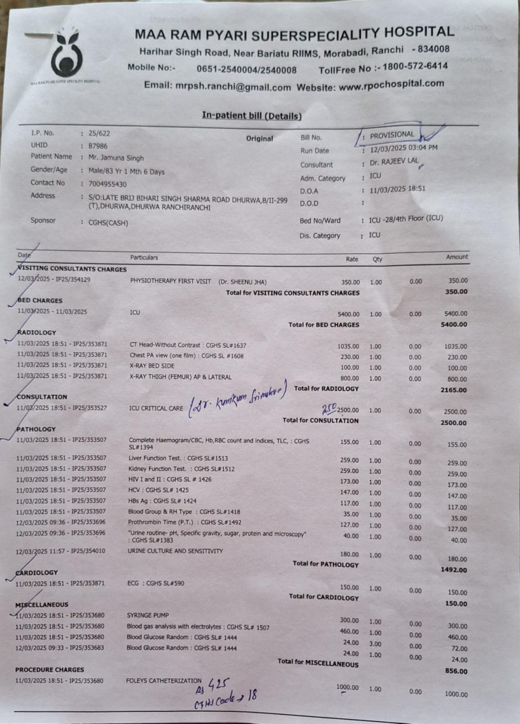 दो बोतल पानी चढ़ाने के बाद वह पूरे होश में आ गए तब तक डॉक्टर अजीत भी वहां पहुंच गए ,उन्होंने बोला कि इनका मेदांता में इलाज कैशलेस हो जाएगा परंतु डॉक्टर के समझाने पर हम लोगों ने वहीं ICU में छोड़ दिया, अगले दिन जब सुबह में बिल के बारे में पूछा गया तो बोला गया कि दोपहर में बताया जाएगा, जब दोपहर में पूछा गया तो बताया गया कि आपका 47000/ बिल हो गया है और इसमें अभी और जुटेगा।