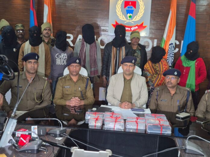वरीय पुलिस अधीक्षक, राँची के द्वारा मादक पदार्थों के विरुद्ध कार्रवाई के संबंध में लगातार दिये जा रहे निर्देशों के आलोक में पुलिस अधीक्षक, नगर, राँची के निर्देशन एवं पुलिस उपाधीक्षक, सदर, राँची के नेतृत्व में एक छापामारी टीम गठन किया गया। गठित छापामारी टीम के द्वारा प्राप्त सूचना के आधार पर शांतिनगर, तिरिल, रोड नं0-10 से बाबला राम के घर पर विधिवत छापामारी किया गया। छापामारी के क्रम में तीन महिला समेत पाँच व्यक्तियों (1) अम्बर कुमार राम उर्फ टमन उर्फ तप तपन, उम्र 24 वर्ष, पिता बाबला राम, (2) बाबला राम, उम्र 48 वर्ष, पिता स्व० दुर्गा राम, (3) मुन्नी देवी, उम्र 40 वर्ष, पति बाबला राम, (4) दिव्या कुमारी, उम्र 21 वर्ष, पिता स्व० अजय सिंह सभी पता शांति बिहार, तिरिल, कोकर, रोड़ नं0-10, थाना सदर, जिला राँची को पकड़ा गया। पकड़ाये व्यक्ति का विधिवत तलाशी के क्रम में अन्य सामानों के साथ कुल 85.71 ग्राम ब्राउन सुगर पकड़ा गया। अभियुक्त अम्बर कुमार राम के निशानदेही पर (5) पियुष कुमार, उम्र 20 वर्ष, पिता मुन्ना सिंह, पता ग्राम फुरहुरिया, थाना परैया, जिला गयाजी (बिहार) वर्तमान पता शांतिनगर रोड नं0-10, तिरिल, कोकर स्थित बाबला राम के घर में किरायेदार, (6) समीर तिर्की, उम्र 35 वर्ष, पिता एडवर्ड तिर्की, पता कोकर बाजार, चौबे कॉलोनी स्थित अन्तु वर्मा के मकान में किरायेदार, (7) अमन कुमार उम्र 22 वर्ष, पिता धर्मेन्द्र भट्ट, पता कोकर बाजार, चौबे कॉलोनी, थाना सदर, जिला राँची को पकड़ा गया तथा सदर थाना काण्ड संख्या-632/2025, दिनांक 30.12.2025, धारा 111(2) (b) BNS एवं 21(b)/22(b)/23/25 NDPS Act. दर्ज किया गया ।